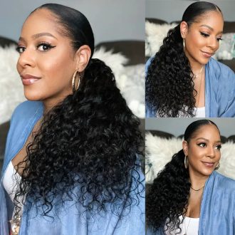 Water Wave Quick & Easy Drawstring Ponytail Extension Human Hair Natural Black Sleek Ponytail
