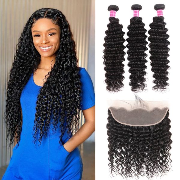 10A Deep Wave Brazilian Hair 3 Bundles With Frontal Human Hair