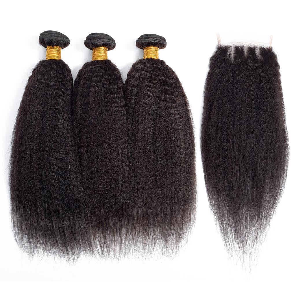 Kinky Straight Hair 3 Bundles with Closure 10A Brazilian Human Hair Natural Color